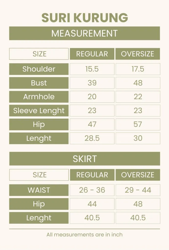 | SURI KURUNG SIZE | OVERSIZE, REGULAR |