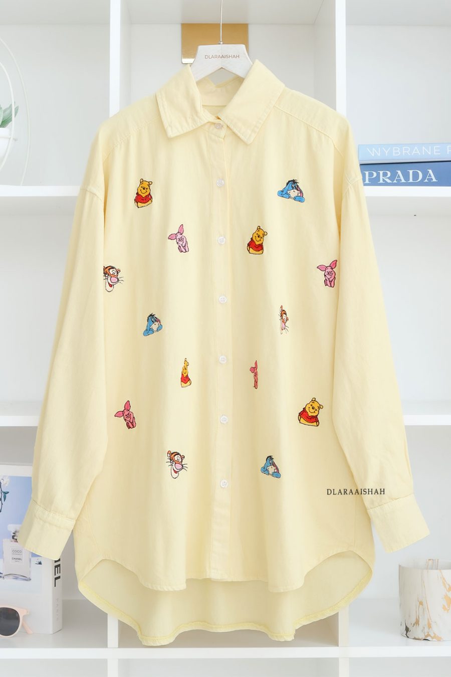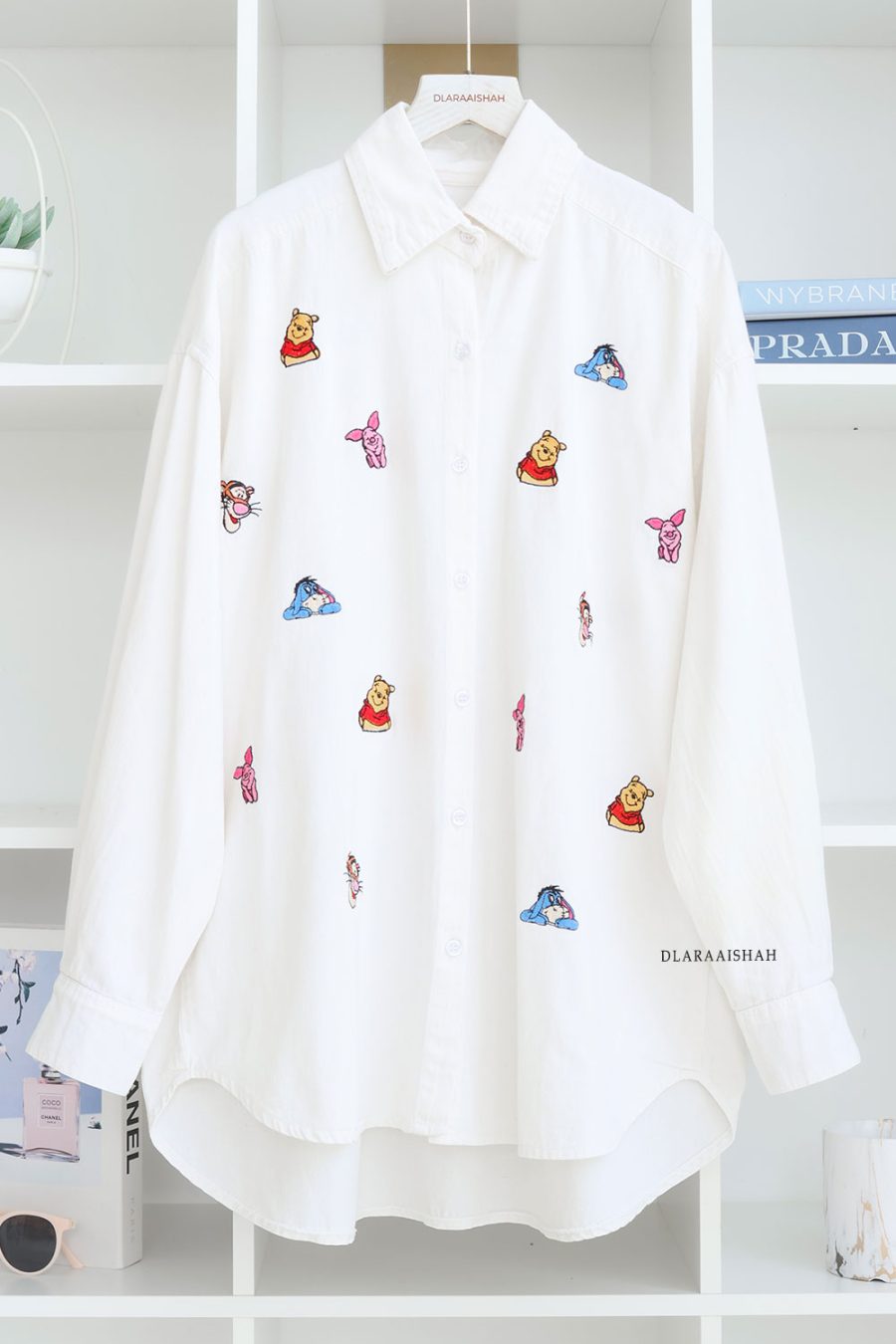 Design: • Casual oversized denim shirt. • Features adorable embroidered cartoon characters. • Classic collar with full front button closure. Material: • Soft Premium Denim , lightweight, breathable, and super comfy for all-day wear. • Smooth texture with a relaxed drape that gives a chic casual vibe. Details: • White contrast buttons along the front….