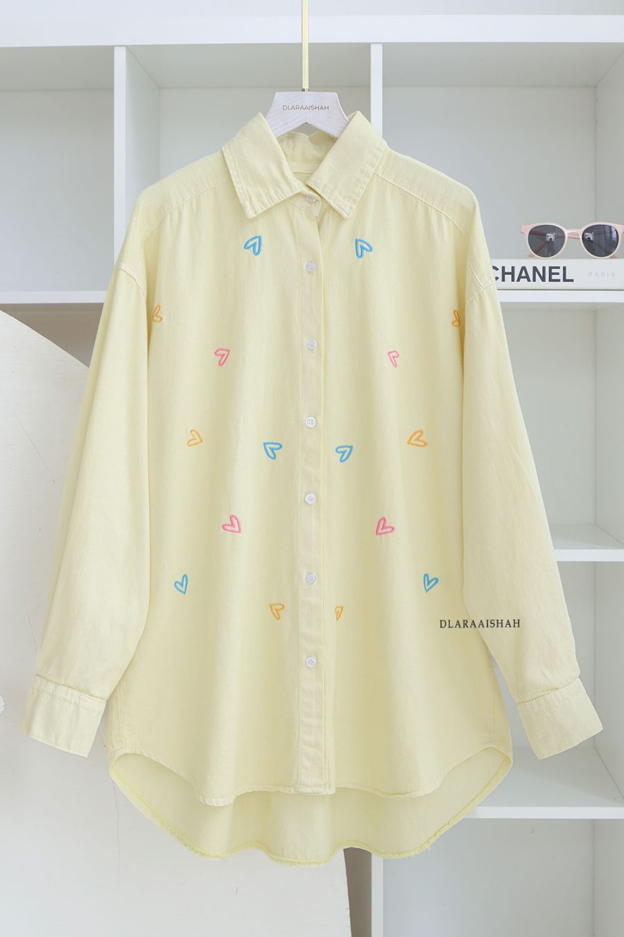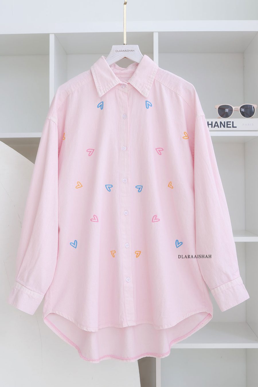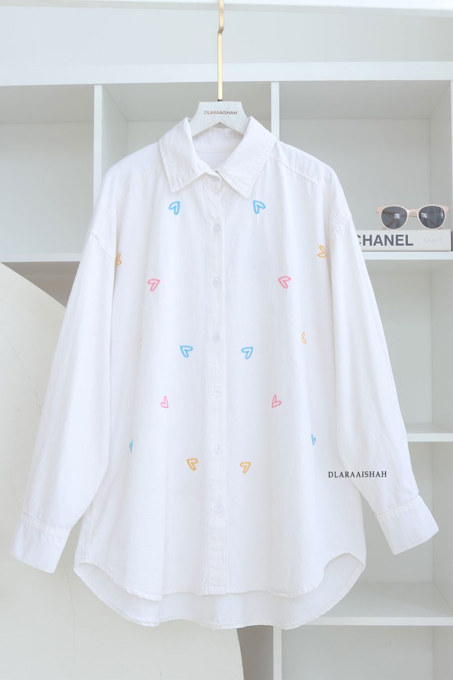 RM89.90 RM65.90 Design: • Casual oversized denim shirt. • Features adorable embroidered love. • Classic collar with full front button closure. Material: • Soft Premium Denim , lightweight, breathable, and super comfy for all-day wear. • Smooth texture with a relaxed drape that gives a chic casual vibe. Details: • White contrast buttons along the front. •…