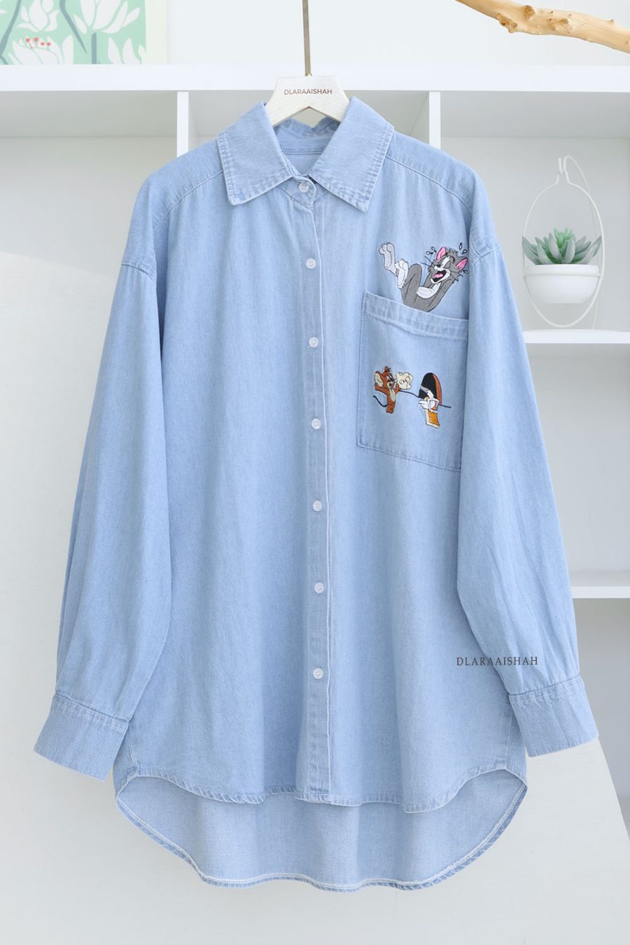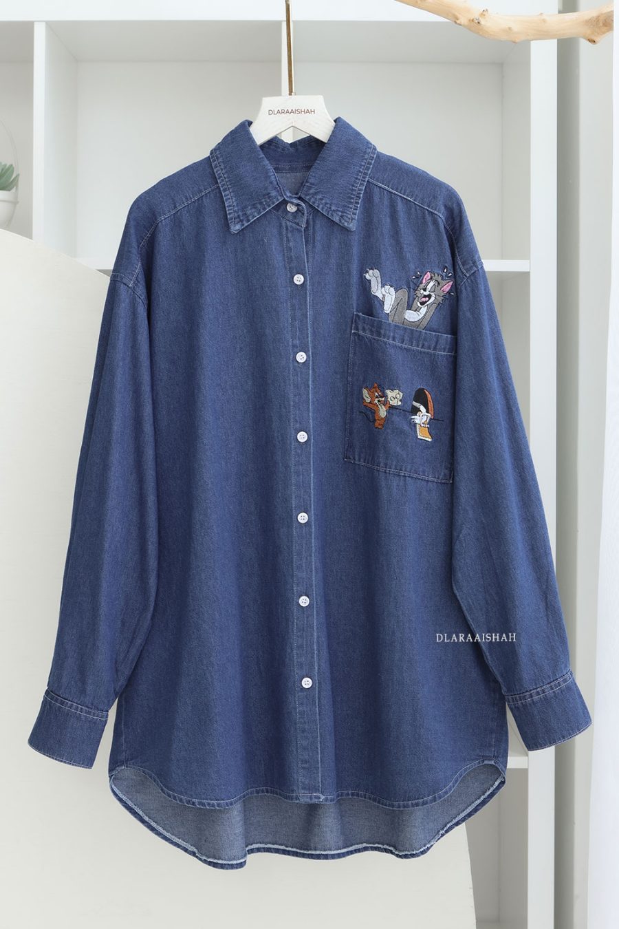 RM89.90 RM65.90 Design: • Casual oversized denim shirt. • Features adorable embroidered cartoon characters. • Classic collar with full front button closure. Material: • Soft Premium Denim , lightweight, breathable, and super comfy for all-day wear. • Smooth texture with a relaxed drape that gives a chic casual vibe. Details: • White contrast buttons along the front….