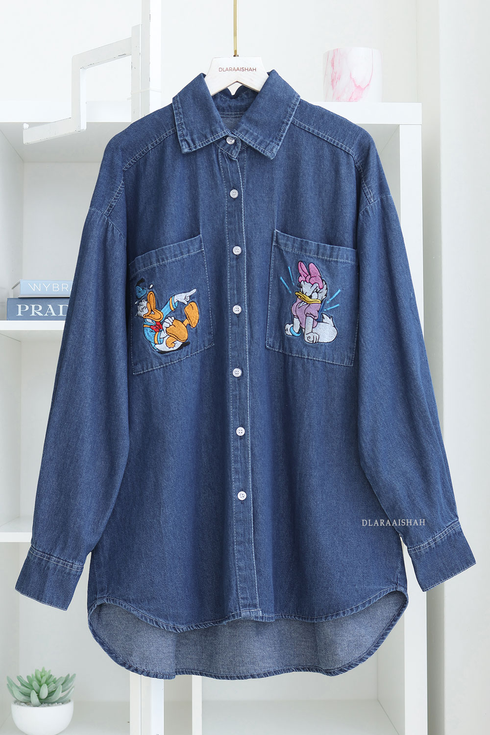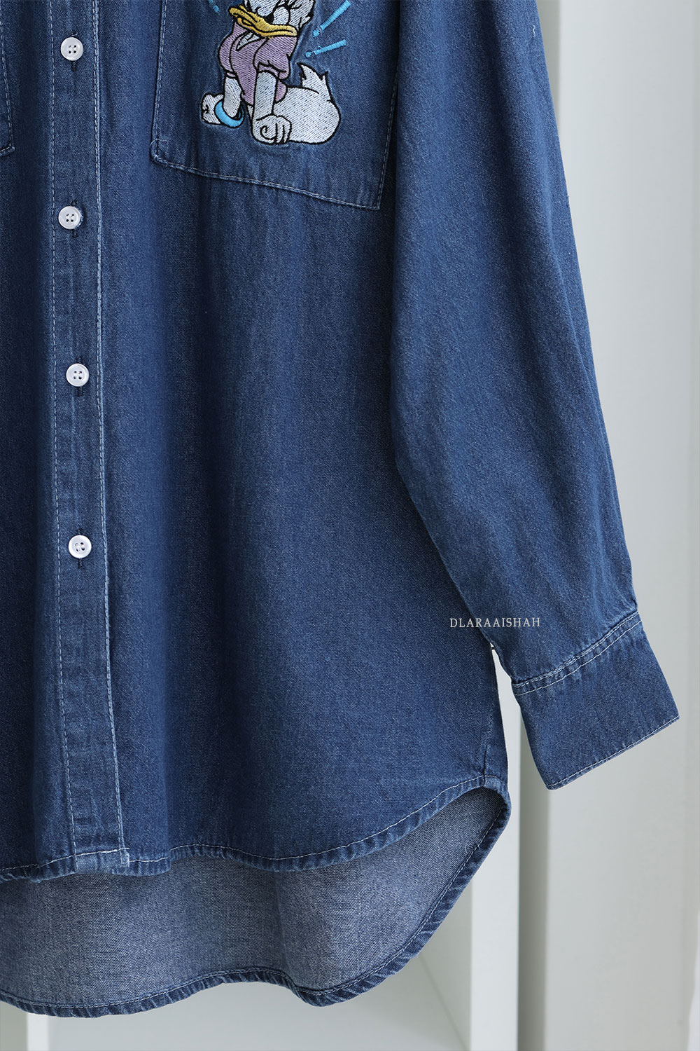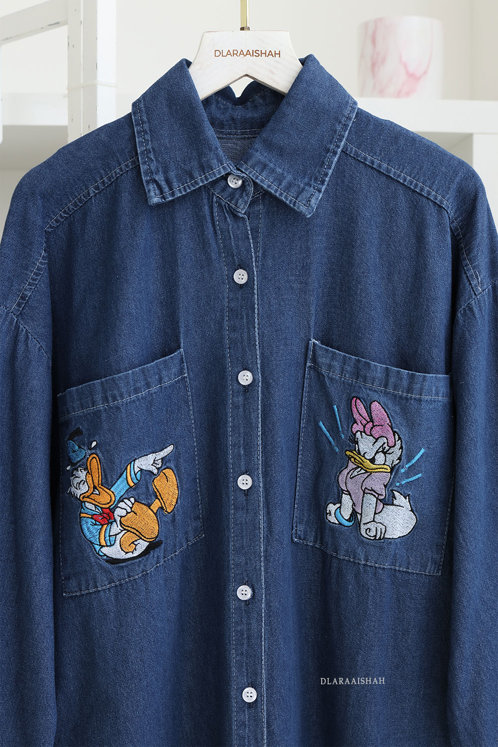 • Features adorable embroidered cartoon characters on each pocket for a playful touch.
