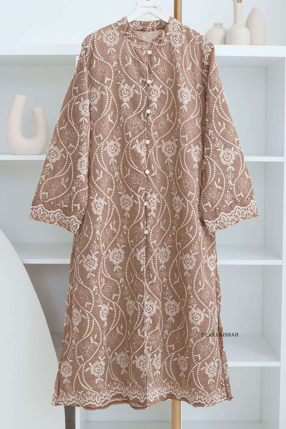 Ophelia direka menggunakan cotton linen embroidery premium, fabrik eksklusif dengan sulaman penuh yang halus dan kemas.