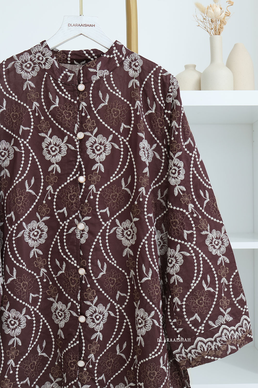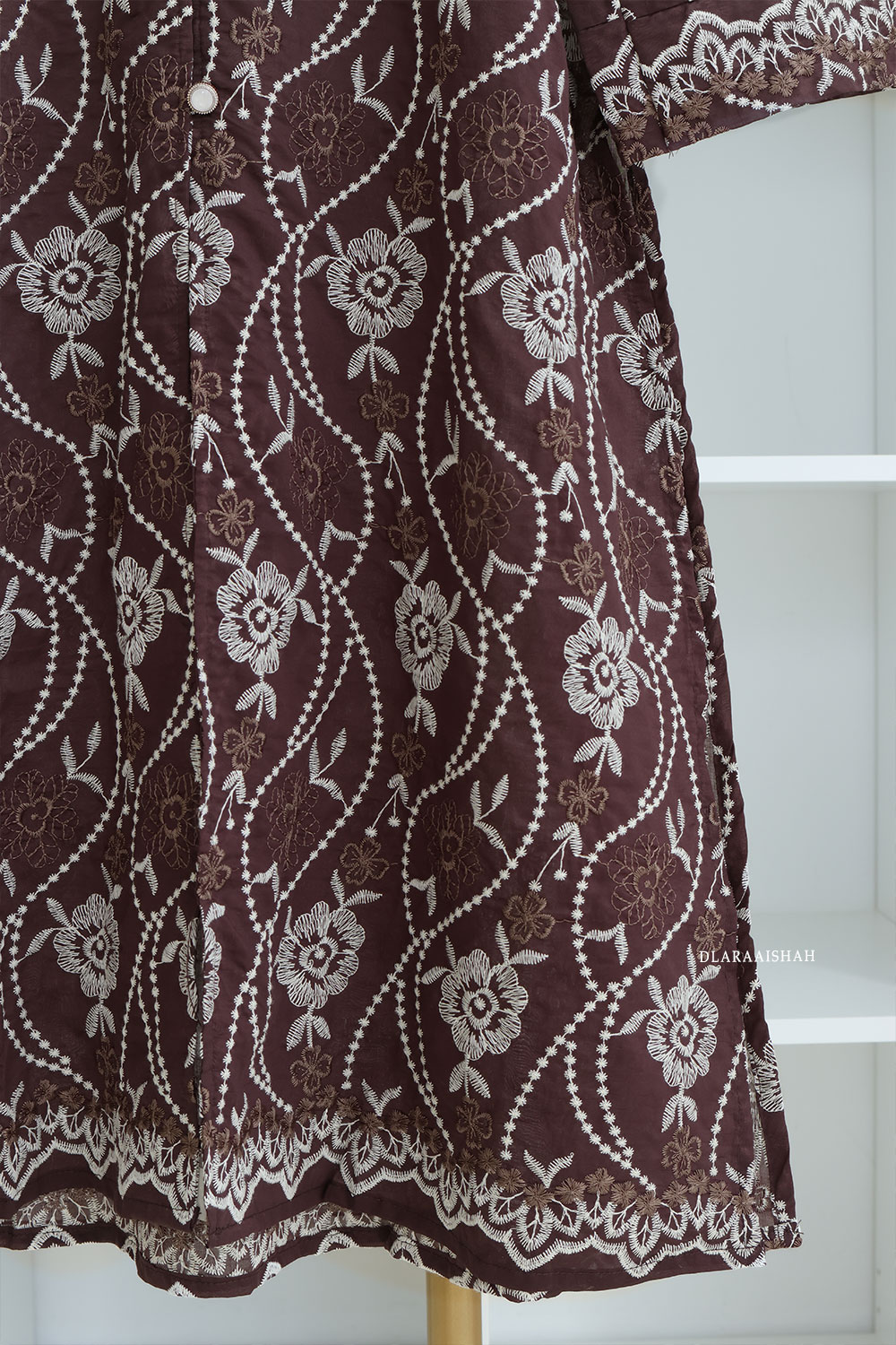 Ophelia direka menggunakan cotton linen embroidery premium, fabrik eksklusif dengan sulaman penuh yang halus dan kemas.