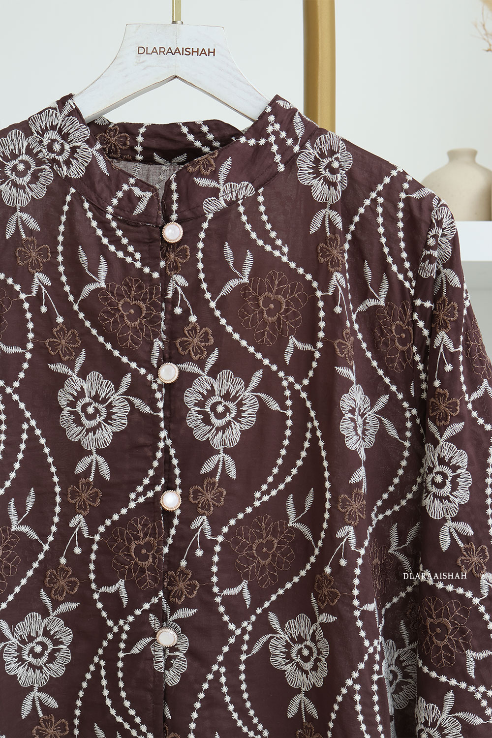 - Depan penuh (full button down) dengan butang pearl berbingkai keemasan, menambah touch klasik.